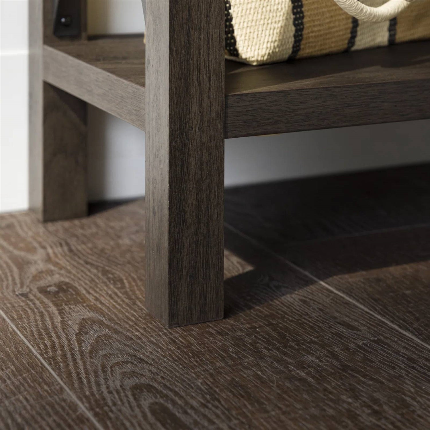 Transform your entryway with this Industrial Farmhouse Entryway Table / Sofa Table in Brown Grey Wood Finish. Combining urban industrial and farmhouse style, this table creates a warm, inviting atmosphere for your home. It features corner metal accents and x-shaped sides for a stylish design. The lower shelf, made from durable laminate, offers convenient storage for shoes or decorative items. This versatile piece works beautifully as an entry table or sofa table, adding both function and flair to your living space.